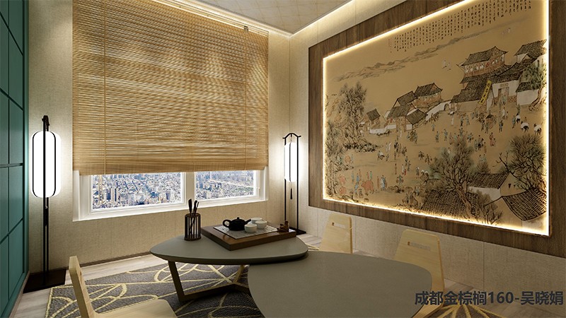 古樸的壁畫配上卷簾,讓人如處古代,坐于當(dāng)中對酒飲茶,美不勝收。
