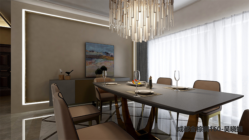 從入戶玄關(guān)進(jìn)來到客餐廳,玄關(guān)與餐廳是連接在一起的,頂面的石膏線條與懸掛的吊燈,不會覺得很突兀,反而增加了藝術(shù)美感,簡潔的椅子配上低奢的餐桌以及墻面的裝飾畫,美輪美奐??蛷d沙發(fā)的顏色搭配也給人一種視覺美感。